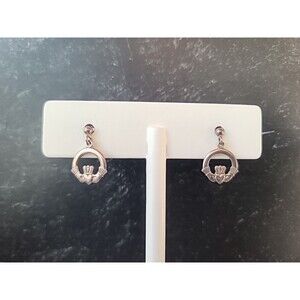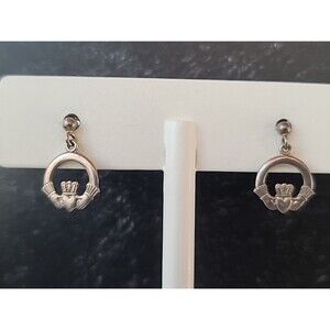 These are a vintage pair of 925 sterling silver Claddagh dangling pierced earrings.
