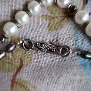 This listing is for a vintage, glass pearl necklace. It appears to be artisan made, and the clasp is signed 925. Between each faux pearls there are spacer beads and the pearl beads measure approximately. The pearls measure 7.5mm. As you get closer to the back there are small oblong faux pearls that look like Tahitian. The necklace measures approximately 20" long. There is a little slack on the cord. I will include a generic dust bag for storage. I have lots of cultured and faux pearls listed in my closet as shown in the last photos. This listing is only for the necklace described. Buy with confidence careful packaging promised. I love to bundle.