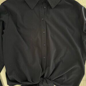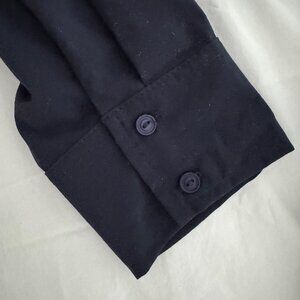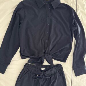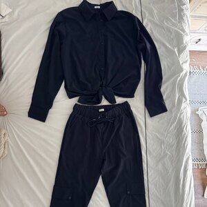 Lightweight, comfortable dark navy outfit. Long sleeve top (sleeves can be rolled); elastic waist pants with lots of pockets.