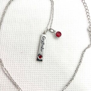 Show off your Gryffindor pride with this sterling silver Gryffindor charm necklace with red faux ruby / CZ crystal charm. Gryffindor is engraved on a silver bar with a small red gem at the bottom, with points engraved around the gem to make it look like an 8-point star. The charms are free-floating on the s925 dainty chain necklace. The Hogwarts H is on the very last link of the extender chain. 925 is engraved on the back of the Gryffindor bar, on the lobster clasp, and on the back of the H at the end of the chain. The silver link that connects the charms to the necklace have been soldered shut to help prevent loss of charms. Spring ring closure.