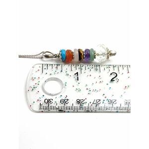 - Vibrant multicolor gemstones from the bottom up you have clear quartz, green opal, purple amethyst, tigers eye, moonstone, orange carnelian, and blue turquoise at the very top.