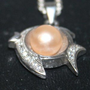 925 Sterling Silver (Tested and marked) Genuine cultured Pearl with sparkling white Sapphire (Tested with presidium gem tester) Fish Pendant Necklace. Measurements and weight in photos. Super cute. Pre-owned in very good condition as shown. Just waiting for you!