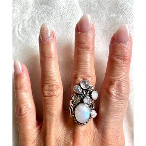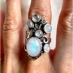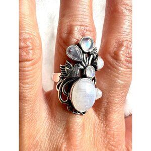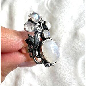 925 Rainbow Moonstone BIRD Flower Ring 6, 7, 8, 8.5, 9, 10