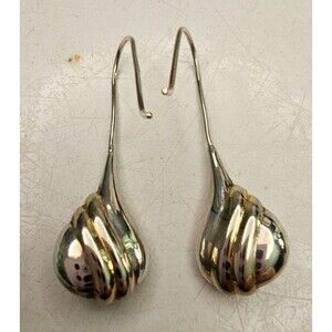 925 Ribbed with Gold Puffy Tear Drop Threader Style Earrings 1 5/8"Lx1/2"W