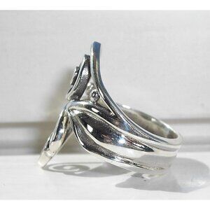 NWOT 925 solid Sterling Silver Ring. This ring is a size 7 without being stretched, it will go bigger but not smaller. This unique women's fashion ring is a swirl design bypass ring. It's 25 (mm) wide at its widest point, is stamped 925 and has a Rhodium finish for greater shine and durability. Comes from a smoke free home.