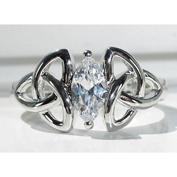 NWOT 925 solid Sterling Silver Ring. This dainty little women's fashion ring has a clear 8x4 (mm) 0.5 carat marquise CZ in the center with Celtic Triquetra design on each side. It's 9.9 (mm) wide at its widest point, is stamped 925 and has a Rhodium finish for greater shine and durability. Comes from a smoke free home.