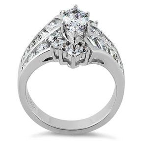 This gorgeous women's fashion ring has a 10x5 (mm), .95 Carat clear Marquise cut stone in the center with round cut accent stones and round and baguette channel set stones on the shank. All stones are clear Cubic Zirconia and have lots of sparkle. The ring is 19.3 (mm) wide at its widest point. Its stamped 925 and has a Rhodium finish for greater shine and durability. If you don't see the size you want please contact me and I will see if I can order one for you.