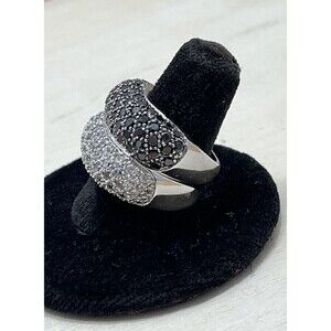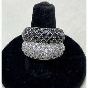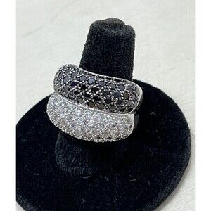 Elevate your style with this stunning 925 sterling silver double band ring that exudes contemporary glamour. The pavé set cubic zirconia creates a dazzling effect that is enhanced by the black and clear color combination. The round-shaped main stone adds to the allure of this beautiful ring.