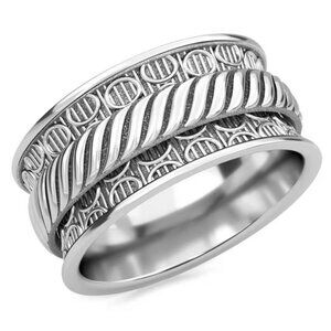 Immerse yourself in timeless elegance with this sterling silver spinner ring featuring intricate textured metalwork. Crafted with precision and care, this sterling silver ring exudes sophistication and charm. Its spinning design adds a touch of whimsy to your ensemble, making it the perfect accessory for any occasion.