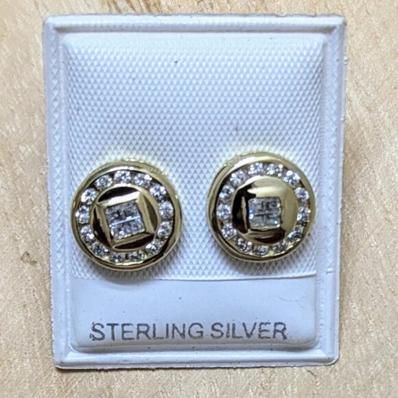 NEW! .925 STERLING ROUND CUBIC ZIRCONIA RHOMIUM & YELLOW GOLD-PLATED STUD EARRINGS - UNISEX