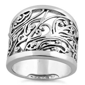 Sizes 7-11 only. NWOT Sterling Silver Ring. This beautiful women's fashion ring has open work intricate vines and scrolls on this wide band ring. This ring is 18.5 (mm) wide at its widest point, is stamped 925 and has a Rhodium finish for greater shine and durability. Comes from a smoke free home.