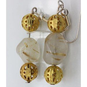 Genuine gold rutilated quartz gemstones between gold vermeil disco ball accents dangling from sterling silver hooks.