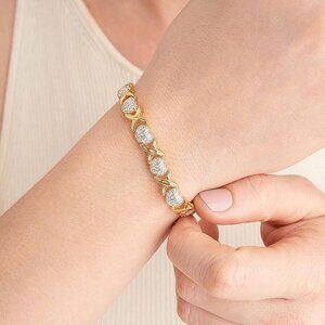 Features: Beautiful tennis bracelet featuring alternating gold 'X' links and sparkling cubic zirconia-filled hearts. Crafted from genuine 925 sterling silver with a warm 18K yellow gold plating, it’s versatile enough to wear daily or dress up for a special night out. The secure box clasp with safety adds extra confidence when wearing.