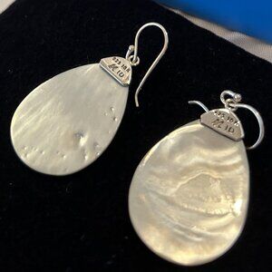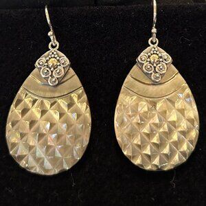 This pair of silver textured earrings are marked "925" and "18K" on the reverse of the decorative finding, along with the maker's mark (see photo). The earrings have a diamond point geometric detail across the drop which measures 1 1/4" top to bottom x 7/8" wide. This pair of brand new, never worn Robert Manse earrings will be delivered in the original packaging and box, also included is a soft cloth drawstring pouch for protection of these lovely silver and 18K accented earrings.