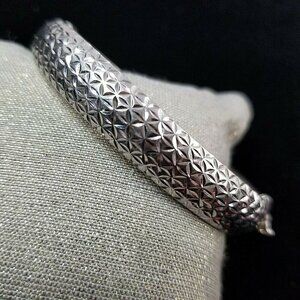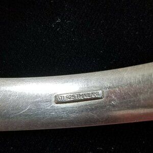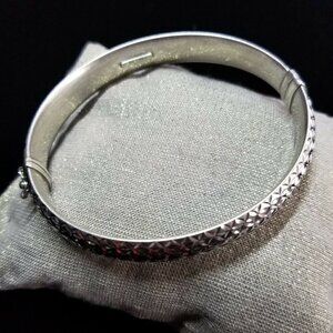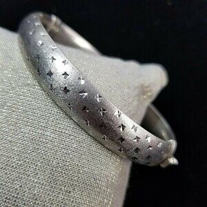 Sterling silver oval hinged bangle. Bracelet is stamped "ATI 925 THAILAND". This is from my mother's personal collection. She said she purchased it at Sam's Club in 2018. It is double sided so it can be worn on either side and won't turn since it is oval. One side is a textured shiny pattern and the other is satiny with diamond cut stars. Bracelet has a safety latch on it. It will fit 7" and under wrist. Weight is a little over 13 grams.
