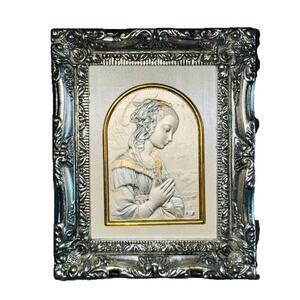 925 Silver Madonna Woman Praying Mini Plaque In Gilt Frame 4" 3D Matted Embossed