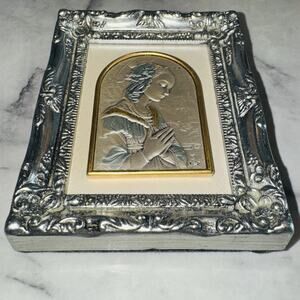 925 Silver Madonna Woman Praying Mini Plaque In Gilt Frame 4" 3D Matted Embossed. Condition is Used. Shipped with USPS Ground Advantage.