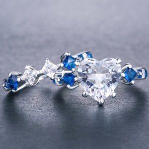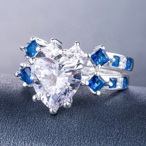 💥925 Silver Plated Blue 2 PCs Heart CZ Couple Ring, MLNN1011