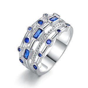 "925 Silver Plated Blue Round Rectangle CZ Double Layer Dainty Ring, UNVN12170