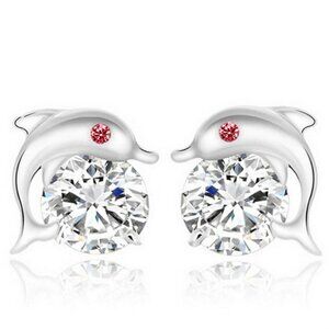"925 Silver Red Eye Dolphin Zircon Stud Earrings for Women, FB16FA1012