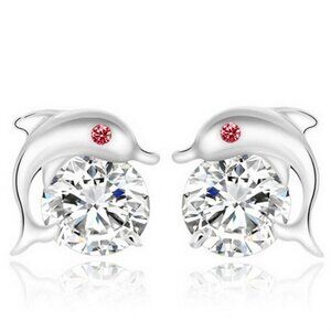 "925 Silver Red Eye Dolphin Zircon Stud Earrings for Women, FB16FA1012