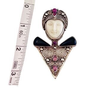 Rare 925 Silver Sajen Bali Carved Goddess Face BROOCH PIN / PENDANT For Necklace Onyx, Ruby, Rhodolite Garnet Gemstones 3” Signed Jewelry - Excellent Condition!