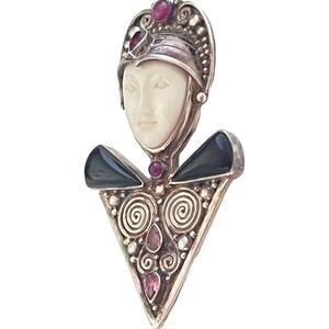 925 Silver Sajen Goddess Face BROOCH PIN PENDANT Onyx Ruby Rhodolite Garnet Gems