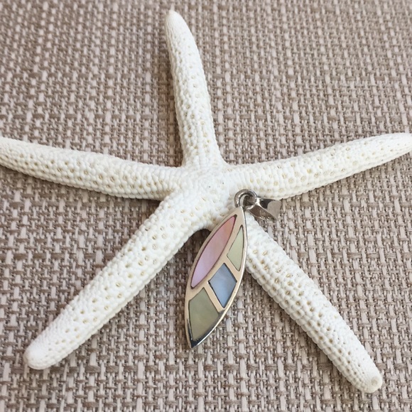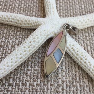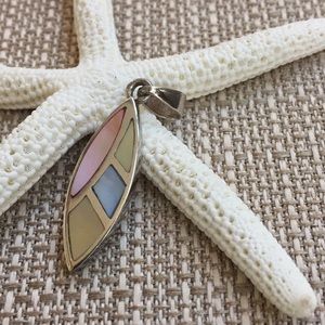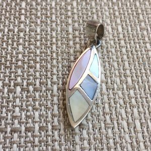 925 Marked. Pendant is Silver with Mother of Pearl Shell Inlay in Colors of Yellow, Pink, Blue. Length is 1”.