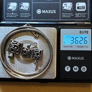 925 Silver Snake Chain + Solid Pendant + Earring Set w/ Scroll Design + Patina