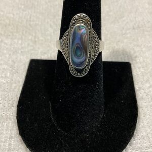 Size 7, band has a little wobble but nothing major. Gorgeous Abalone center.