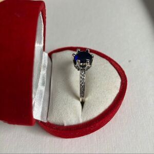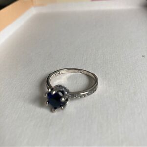 The claw setting of the large blue cubic zirconia creates the effect of a regal crown on the solitaire ring and is complemented by additional small stones set along the ring band. Sterling silver; 925 stamped on the inside of the ring; a heart is etched in the inside of the ring.