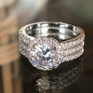 925 stamped sterling silver round cut simulated Diamond ring. Really beautiful, looks and sparkles like real diamonds! New condition and comes in a ring box.
