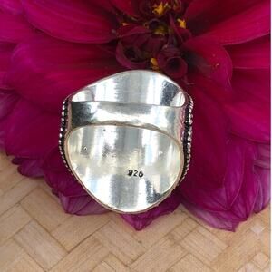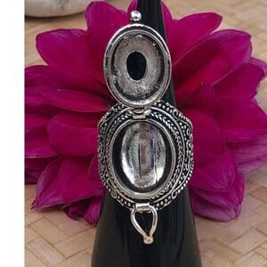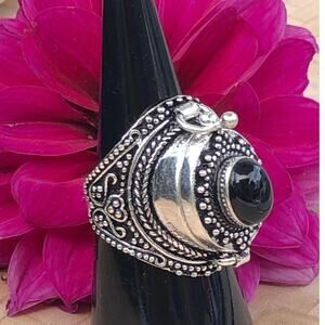 This oval black onyx stone is set in a unique setting. This is a unique pill/poison ring.