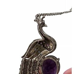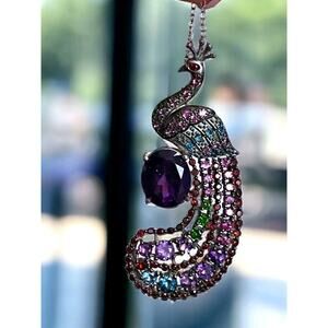 925 Sterling Crystal Peacock Pendant Necklace 2” Signed DK Bird Rhinestones