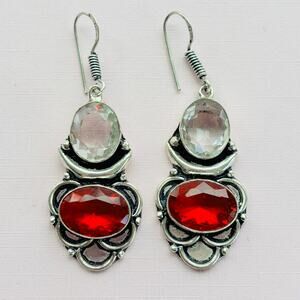 Pretty Dangle Garnet & White Topaz Earrings with 2 stones