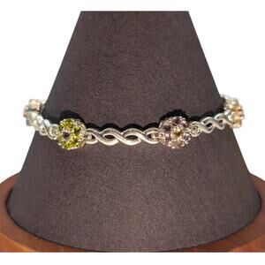 925 Sterling Silver Multi-Color Crystal Flower Cross Over Chain Link Tennis Bracelet. Pre-owned, this sterling crystal tennis bracelet is in excellent condition. Slide in clasp with safety latch.