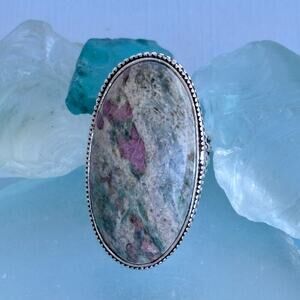 Beautiful Ruby Zoisite Ring in a high bezel setting with a decorative band