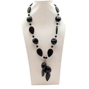 925 Sterling Genuine Pearl Black Carved Wood Leaf Tagua Nut Dangle Tassel 23" Necklace. Pre-owned, this eclectic mix of materials in this fun boho lightweight necklace in black and white neutrals will be a piece that draws attention wherever you go and is in excellent condition. Sterling lobster claw clasp.