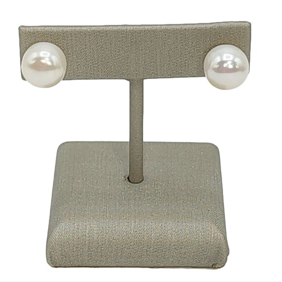 Classic white button near round cultured freshwater pearl stud earrings, 925 Sterling silver. Pearl size 10 mm.