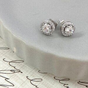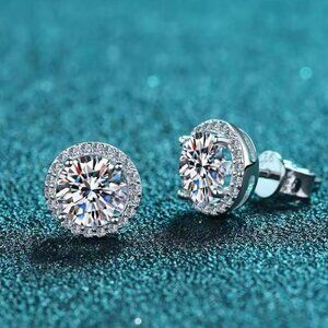 925 Sterling Silver .5 CT 5mm Round Moissanite Halo Stud Earrings. 1 Carot Total Weight for the Pair. New and packaged in a faux suede pouch with box and ribbon, ready for gift giving.