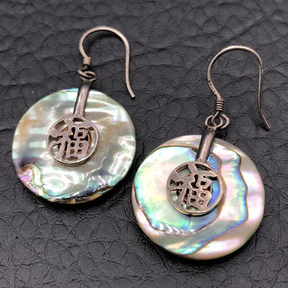925 Sterling Silver Abalone Earrings Iridescent Shell Asian Coin Dangles