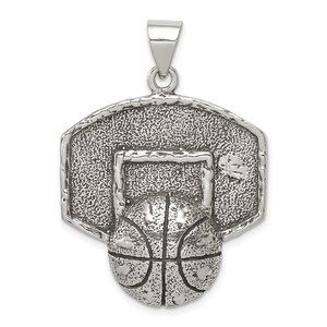 925 Sterling Silver Antiqued & Textured Basketball w Backboard Necklace Pendant Weight: 7.5 grams. Fine Jewelry, Pendants and Charms, Themed Charms, Sports, Basketball, Solid, Polished, Open back, Sterling silver, Textured, Textured back, Antiqued, Purity: 925, Polished, Charm/Element Length: 29.7 mm, Charm/Element Width: 28.55 mm, Feature: Solid, Casted, Sterling Silver, Gender: Men's, Color: White