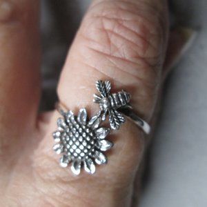 925 Sterling Silver BEE over SUNFLOWER Ring>Queen Bee,Bee's Knees,Sunflower ring