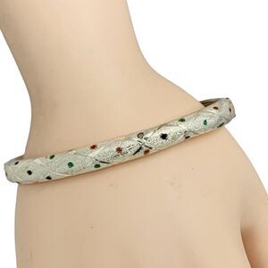 Add a touch of elegance to your outfit with this vintage 925 sterling silver bangle bracelet. The oval-shaped bracelet features a stunning mix of red, green, and blue cubic zirconia gemstones, totaling 44 in number. The bracelet is 7.5 inches in length and has a slide closure & safety lock for easy wear . This piece is perfect for any occasion, including engagements, weddings, graduations, birthdays, and more. The bangle style and pavé setting make it a true beauty, while the vintage and retro themes add a touch of nostalgia and fantasy. This bracelet is a must-have for anyone who loves fine jewelry and wants to add a unique touch to their collection.