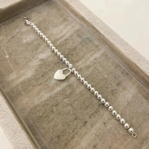 925 Sterling Silver Bead Bracelet Thick Chunky Heart Bracelet Dangle Heart