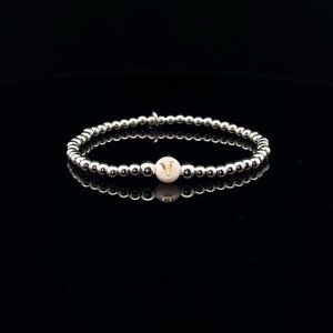 Material: 925 sterling silver 3mm beads, two 4mm Sterling Silver beads, Mother of Pearl Initial Letter and Rafanthia tag. Strong, durable, non toxic elastic.