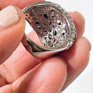 This elegant sterling silver ring features a grid pattern with black and white stones. Its bold design makes it suitable for formal settings.