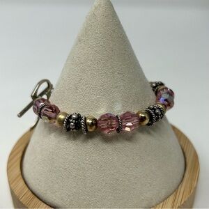 925 Sterling Silver Breast Cancer Survivor Ribbon Charm Pink Beaded Toggle Bracelet 7.5"