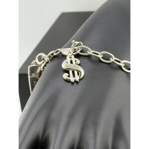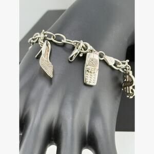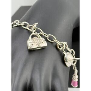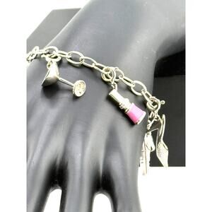 A fun sterling silver charm bracelet with 6 sterling charms. One charm is a pink colored enamel. All but one charm stamped 925. Measures 7 inches. Weighs 25.8g. Very nice looking piece.