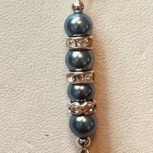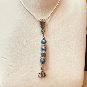 Handcrafted. 925 Sterling Silver Chain w/dangle pendant. 4 round sky blue beads separated by round bezel set clear crystal Rondelle’s. Charm at bottom is Silver tone Om symbol.